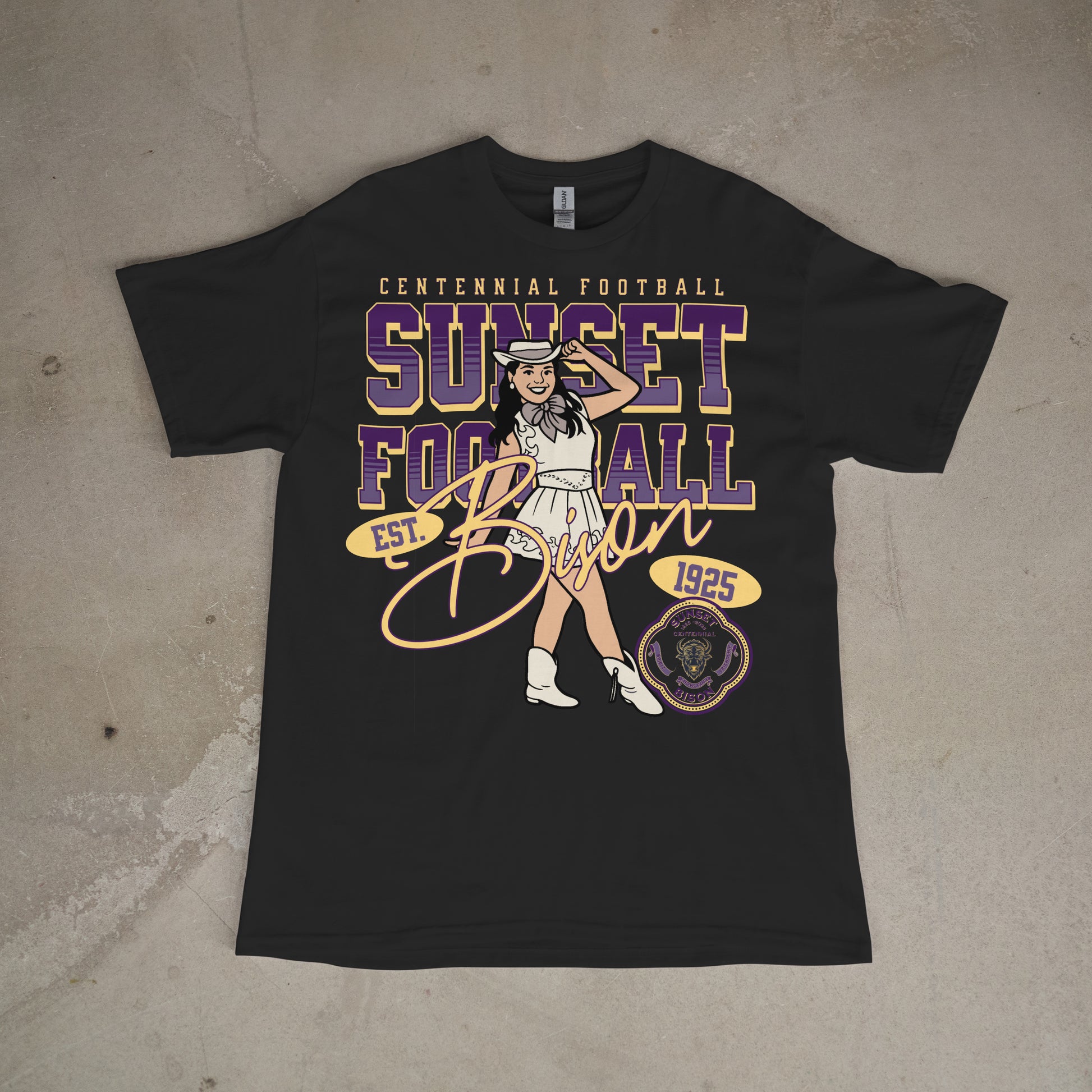 The Bison Belle Proud design honors the proud legacy of the Bison Belles, a sisterhood built on tradition, unity, and leadership at Sunset High School. With vintage flair and school spirit woven into every detail, this design features a confident Belle front and center, framed by bold Sunset Football lettering and the Centennial Bison seal. It’s more than just a uniform; it’s a symbol of pride, grace, and strength passed down through generations.