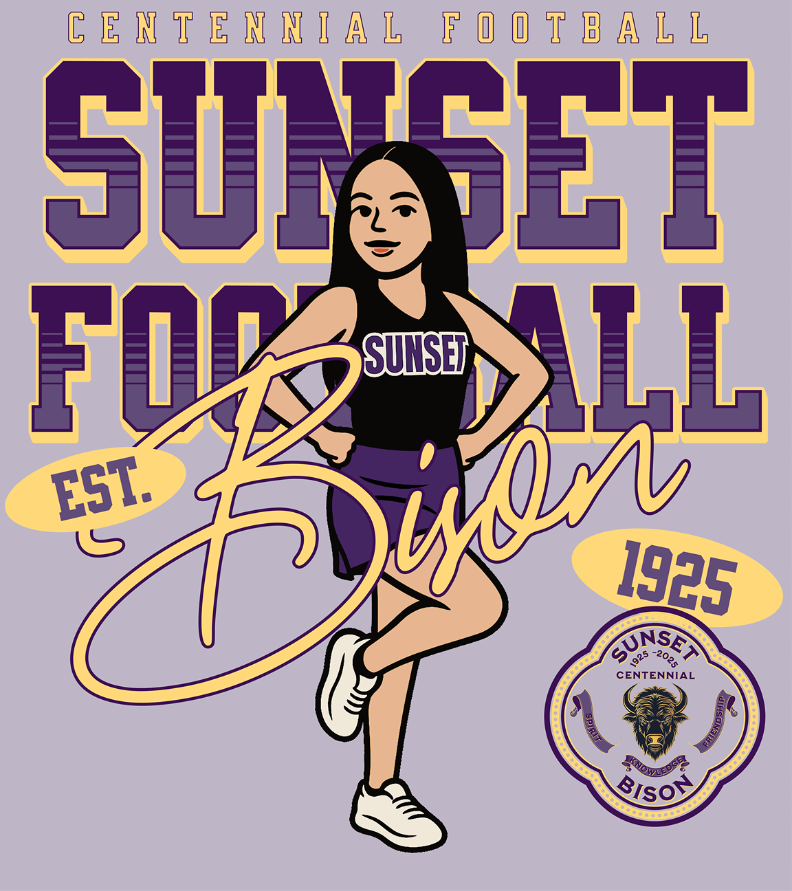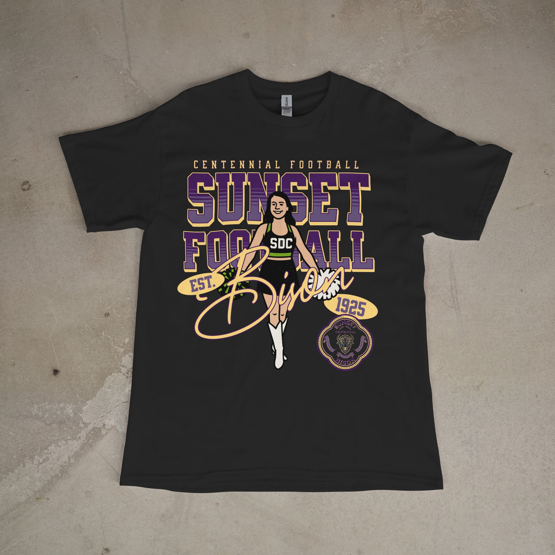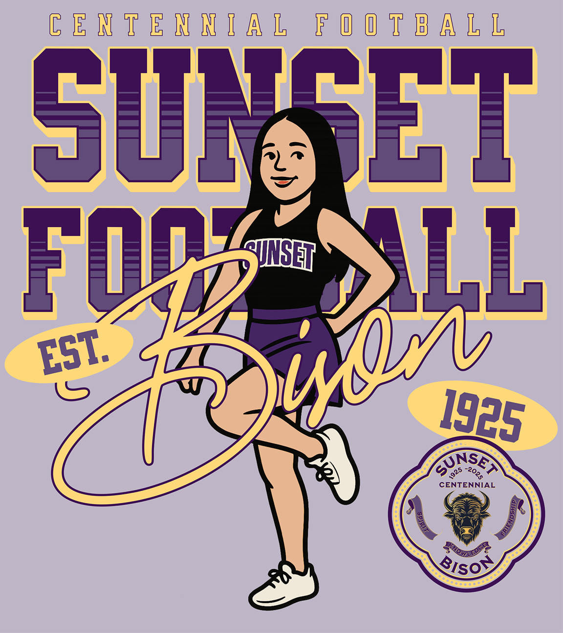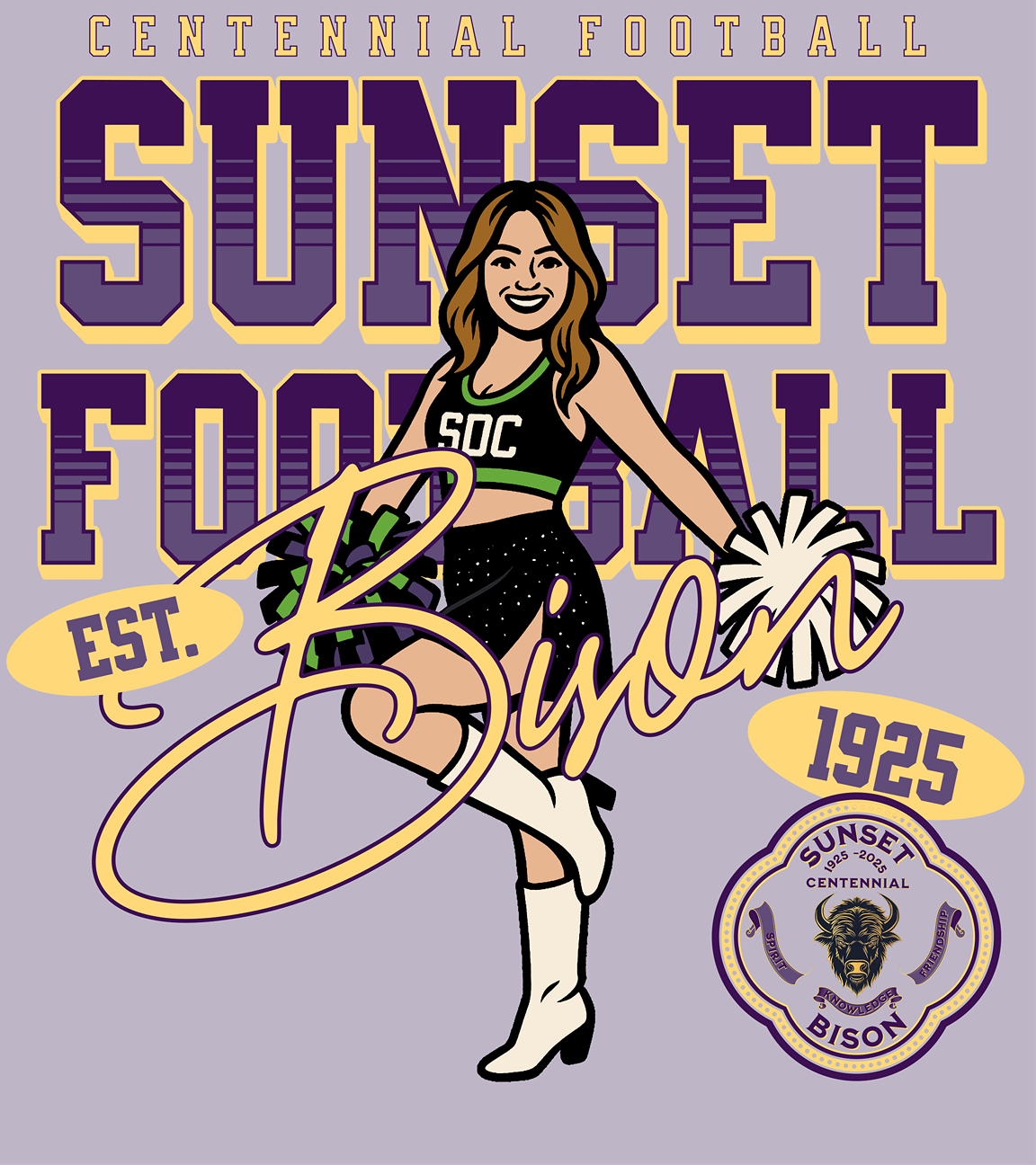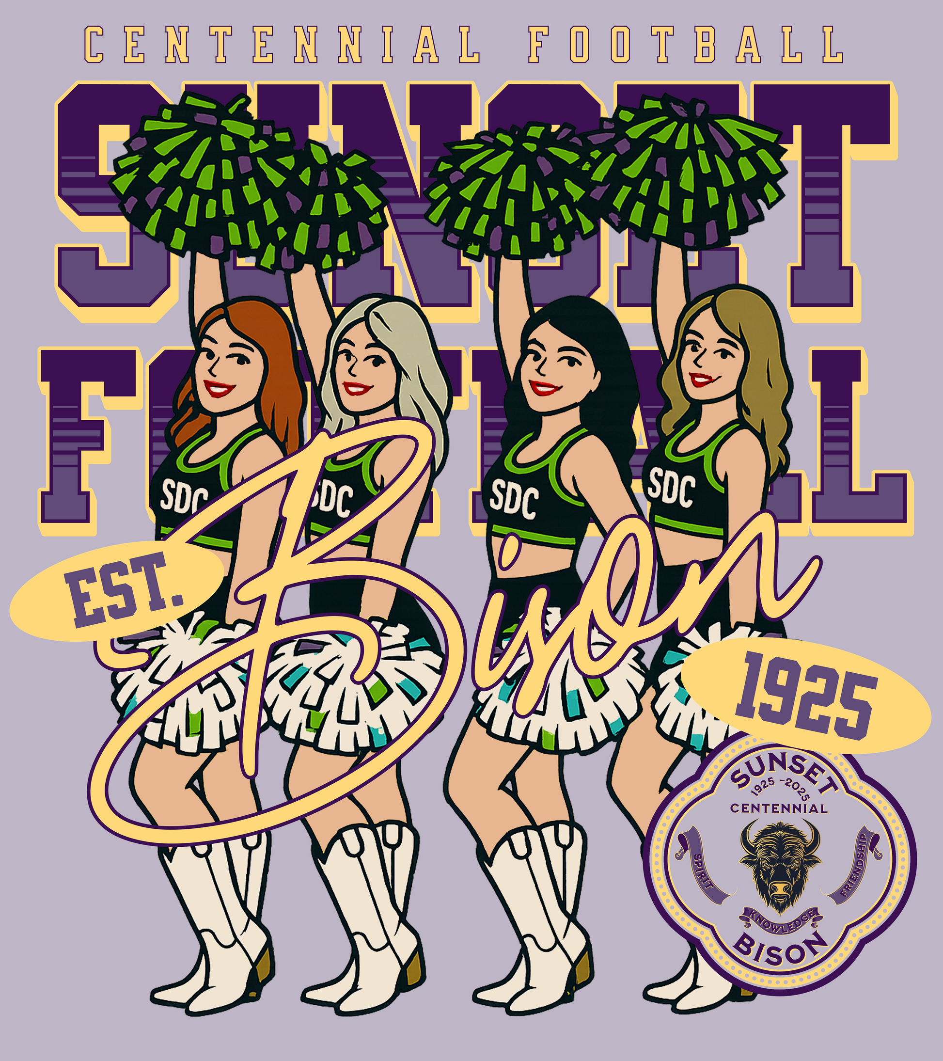 Turn up the spirit with the Sunset Heat: SDC Edition. a tribute to the powerhouse known as the Sunset Dance Company. This design captures the energy, precision, and pride that these dancers bring to every performance. With bold Centennial Football graphics, vintage school colors, and a fierce SDC dancer front and center, it honors both the legacy and the movement of Sunset.