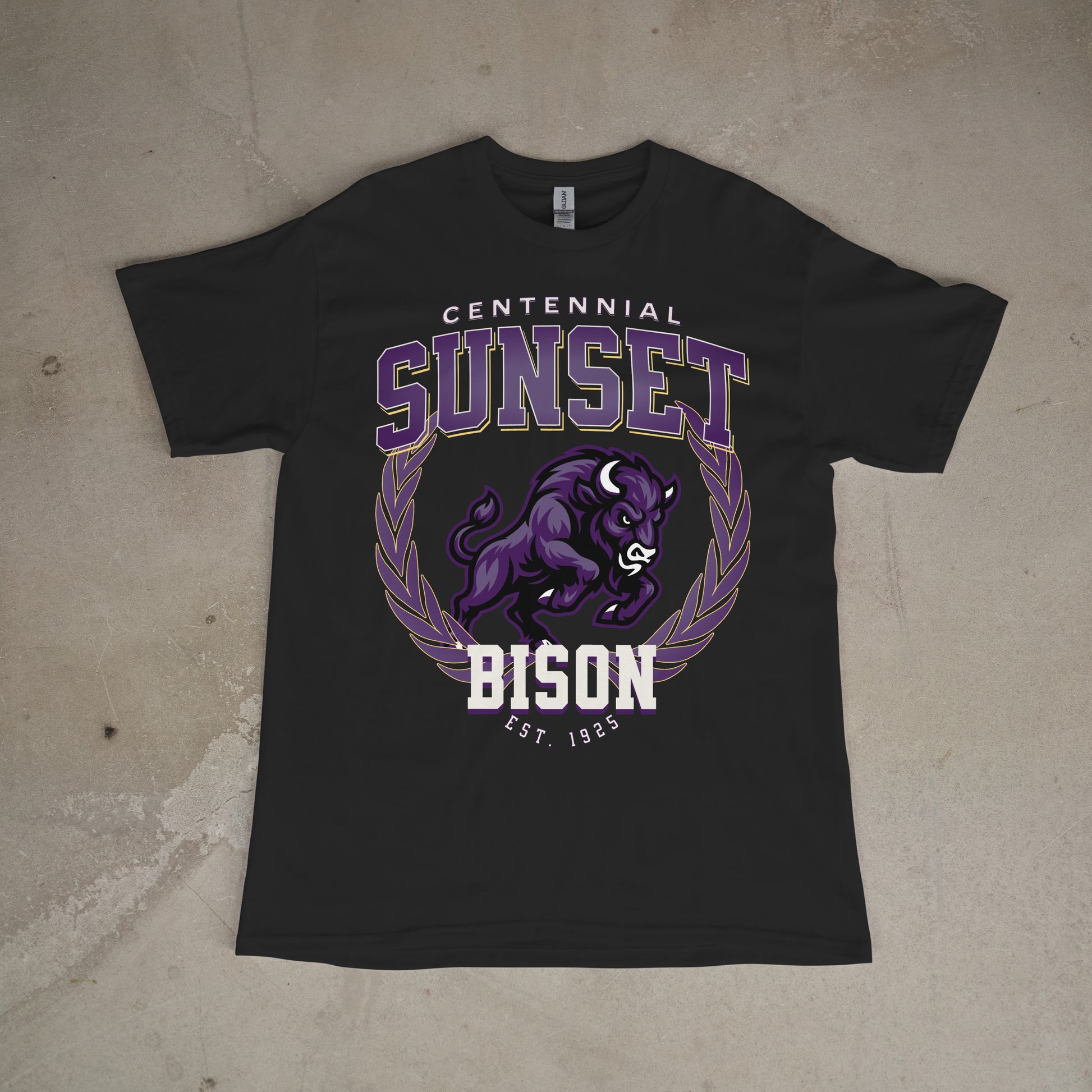 A century of pride. A legacy that never backs down. The Centennial Bison Est. 1925 design celebrates 100 years of Sunset High School with a powerful design built for true Bison. Featuring a fierce, forward-charging bison framed by laurel branches and bold varsity lettering, this shirt is the definition of school strength.
