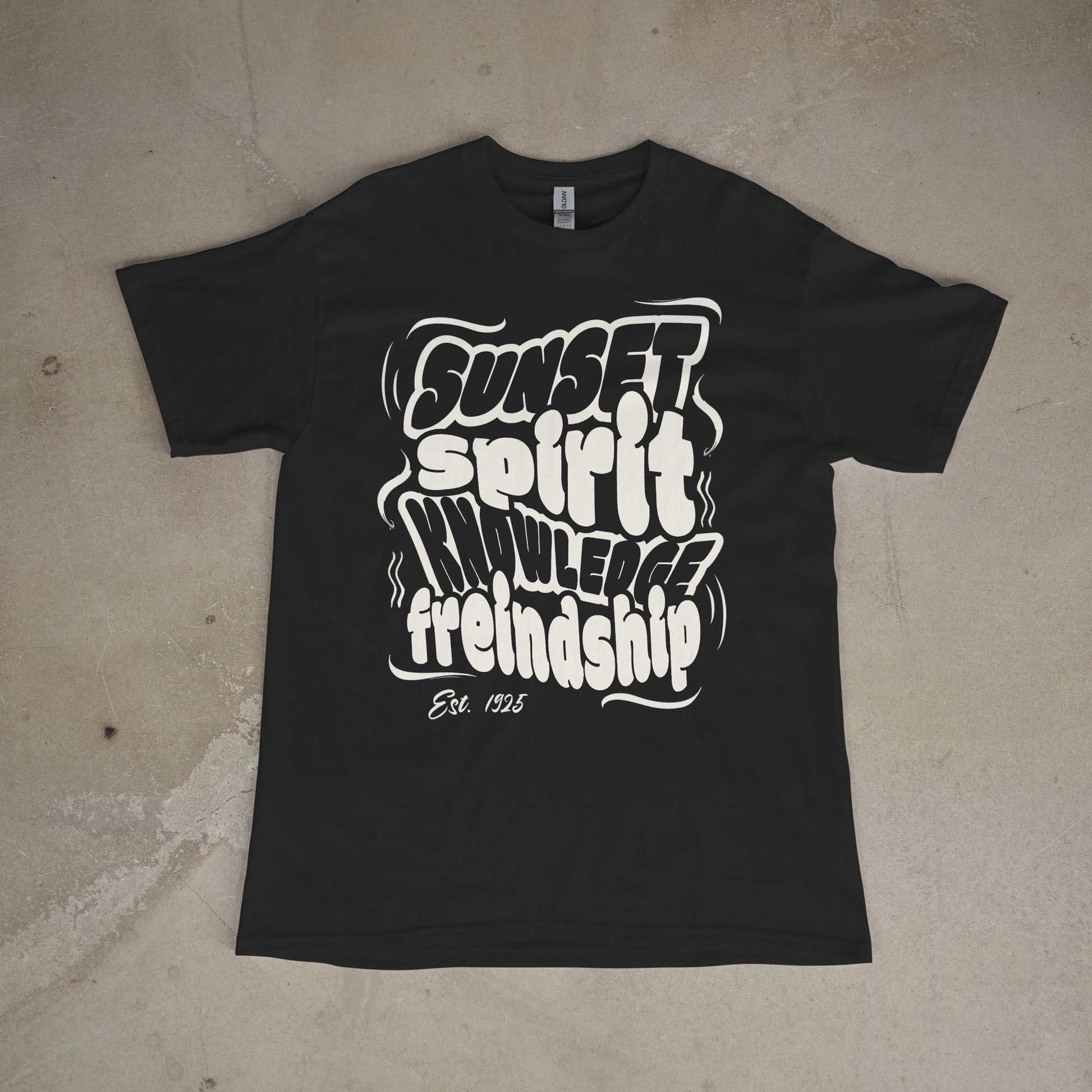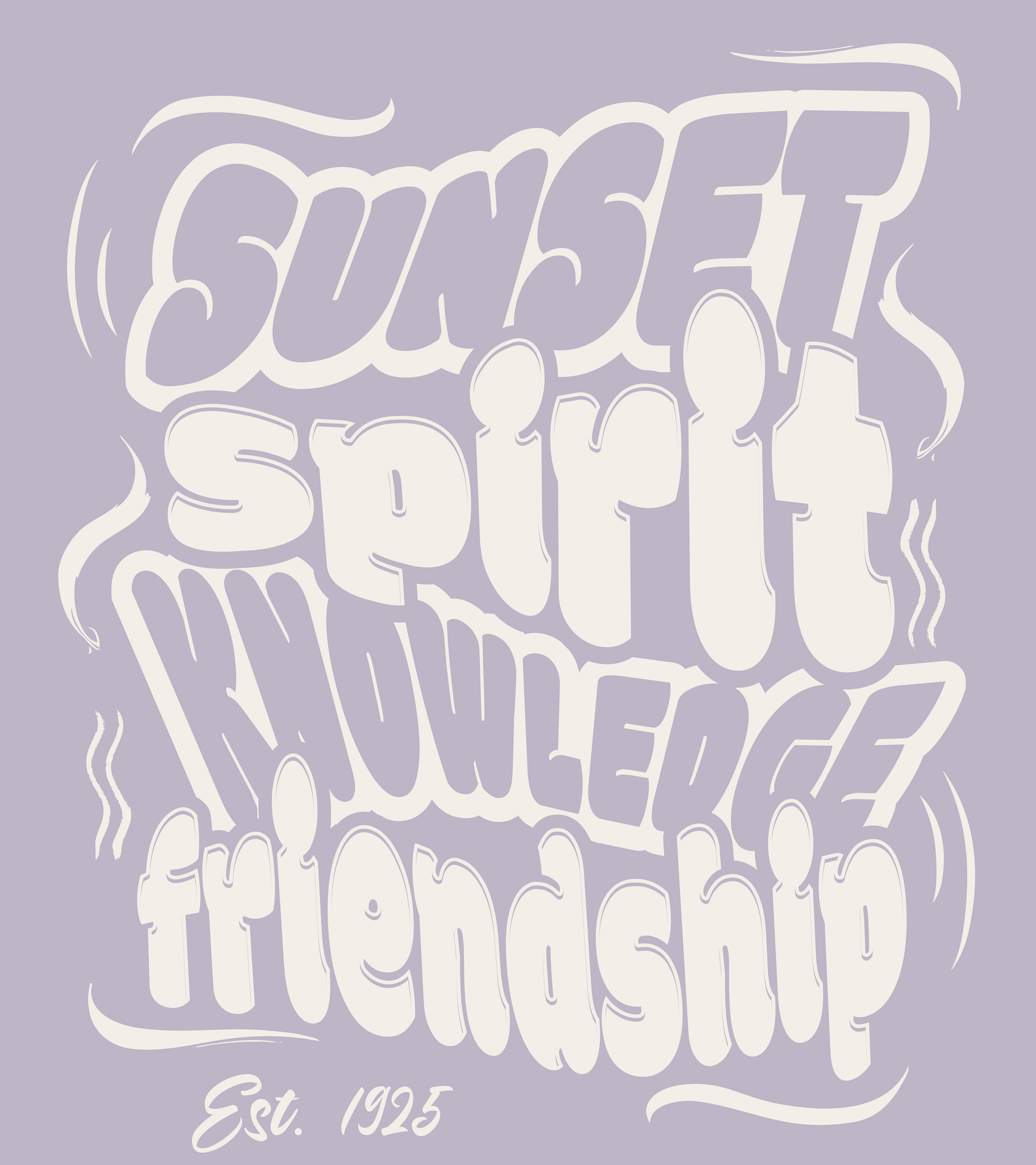 The Core Roots design captures the timeless spirit of Sunset High School with a playful twist. Featuring a flowing, hand-drawn type design, this shirt puts the school’s foundational values, Spirit, Knowledge, and Friendship, front and center. Set against a mellow lavender tone with vintage energy, it’s more than just design; it’s a statement of legacy.