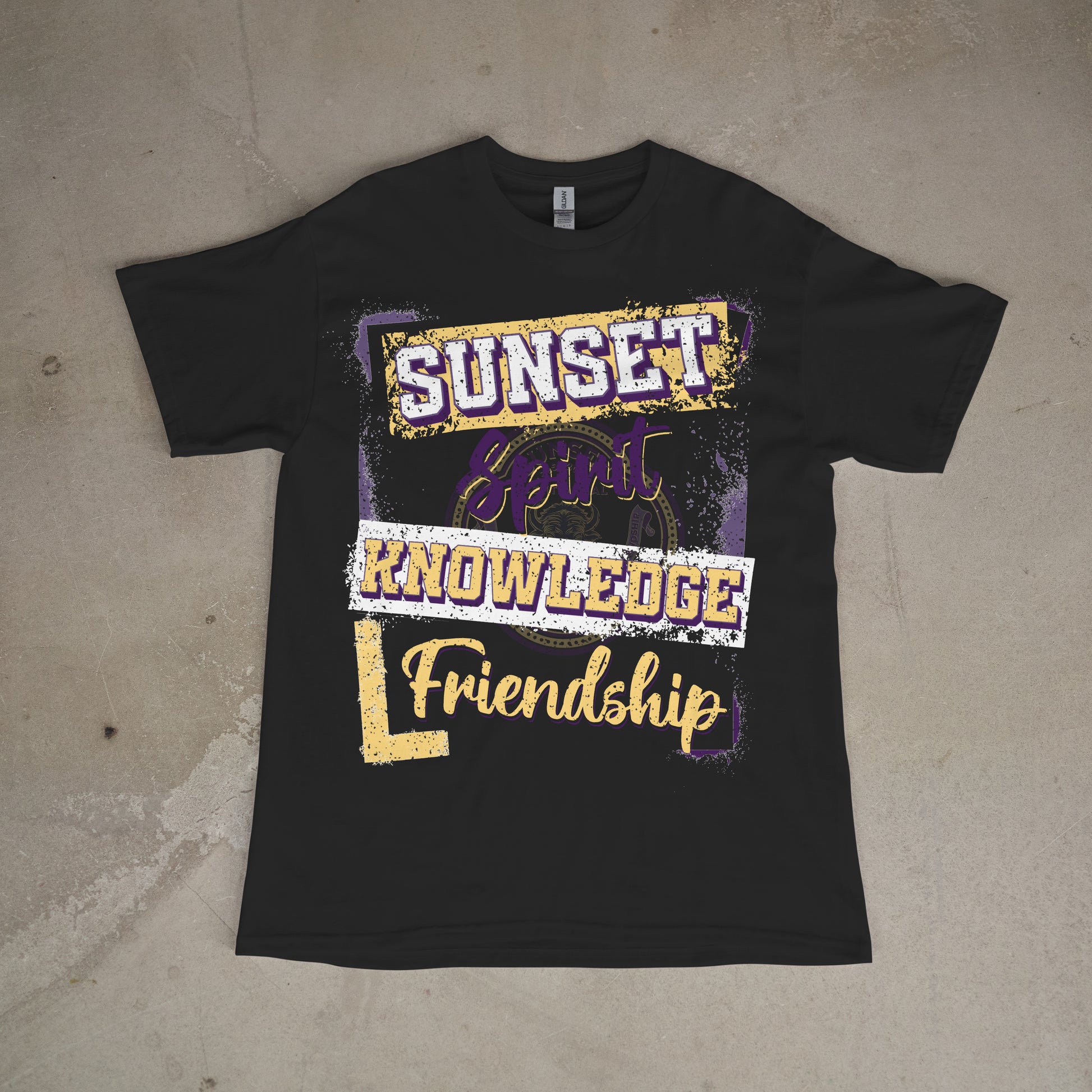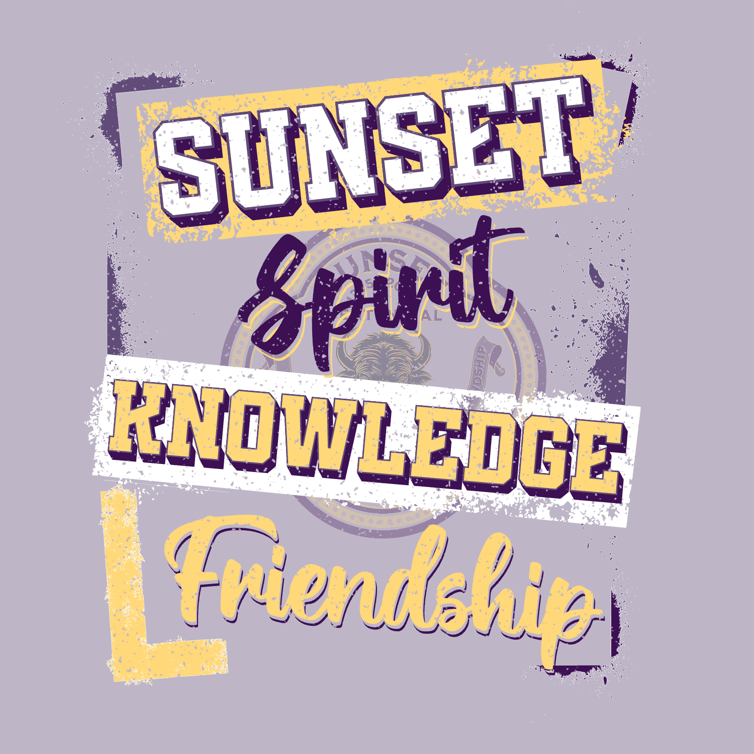 Loud. Raw. Unapologetically Sunset. The Motto design throws it back with a grunged-out layout that highlights the core of what being a Bison is all about: Spirit. Knowledge. Friendship. With distressed textures, bold block lettering, and layered colors in Sunset purple and gold, this design commands attention while keeping it 100% true to the school’s legacy.