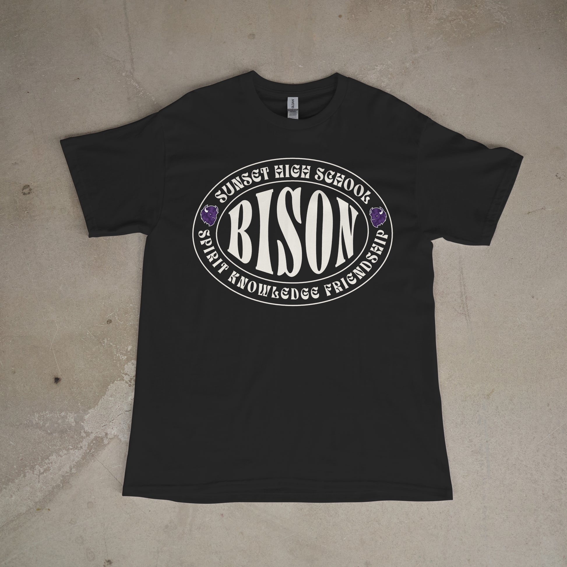 The Original Bison design brings it back to the basics bold, clean, and full of Sunset pride. Featuring an oval athletic crest layout, stylized varsity font, and flanked by two fierce bison heads, this design represents everything that’s always set Sunset High apart.