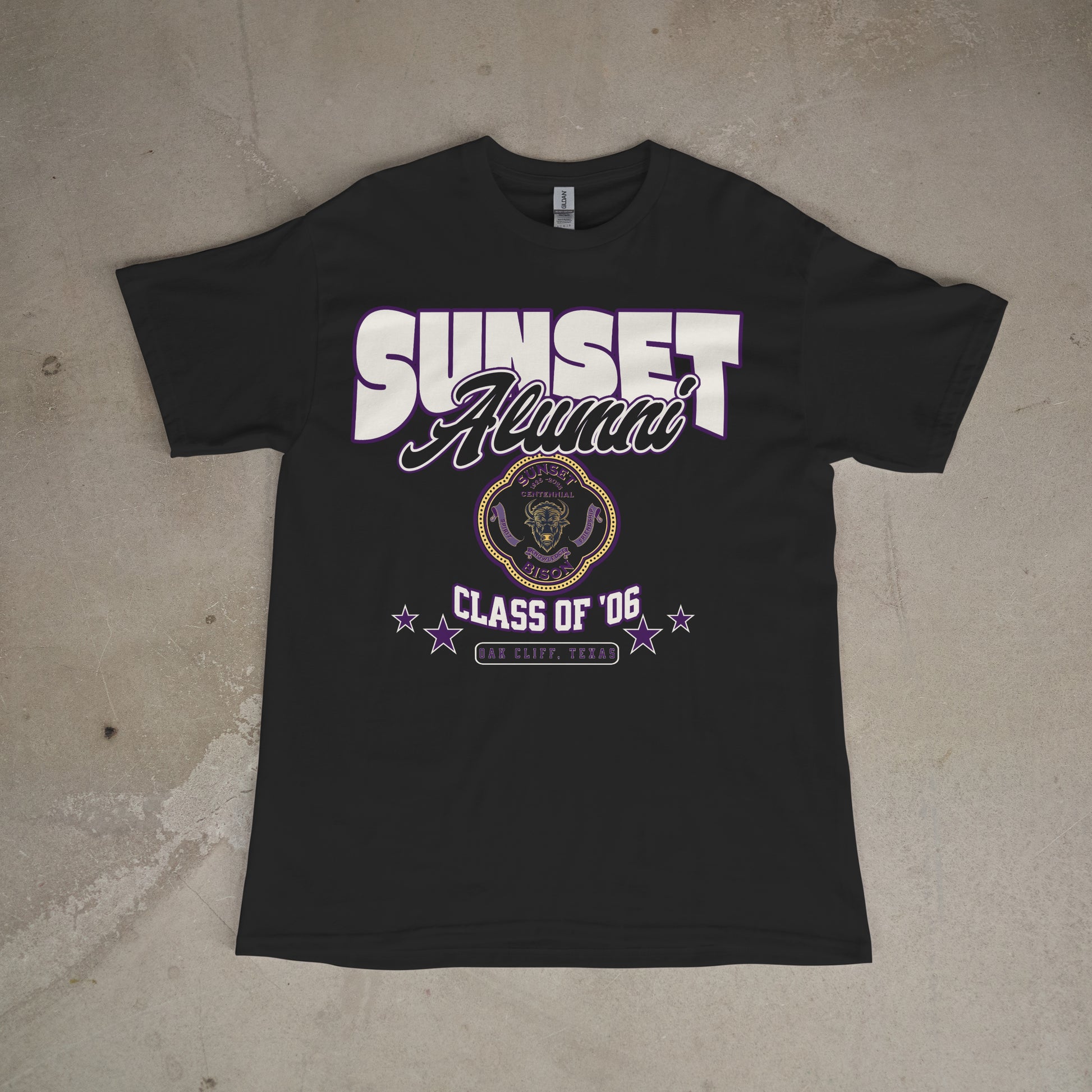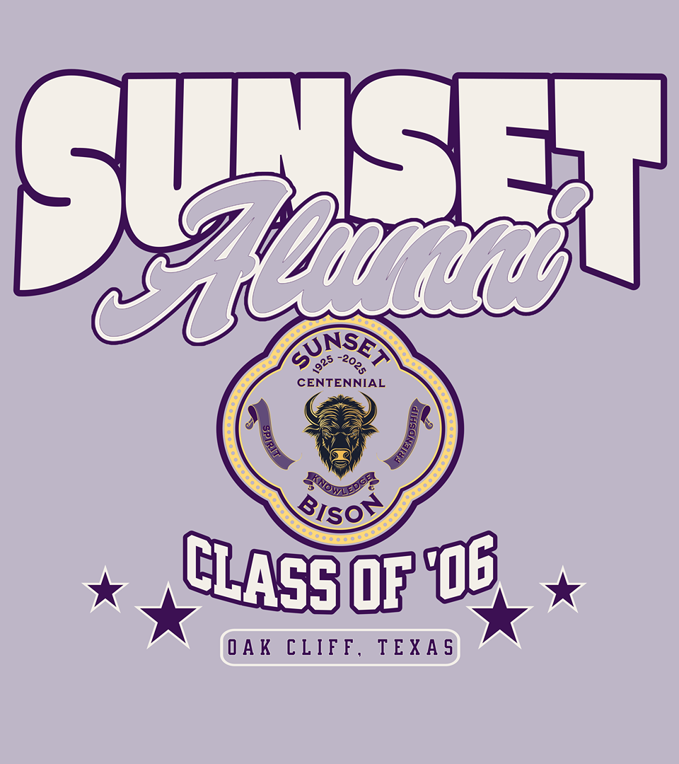 Represent your roots and rep your year, the Back Like We Never Left design is made for Sunset High School alumni who carry Oak Cliff pride everywhere they go. Featuring bold “SUNSET Alumni” lettering, the iconic Bison crest, and a proud Class of ’06 badge, this shirt is more than just a memory, it’s a declaration.